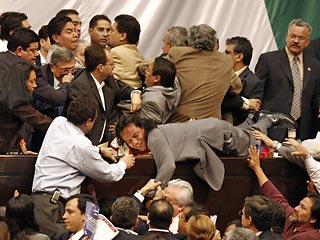 Трибуна нижней палаты парламента Мексики во вторник превратилась в место для потасовок между левыми депутатами и их коллегами-консерваторами. Об этом сообщило местное телевидение. Противостояние в здании Национального конгресса продолжается уже в течении почти 7 часов.