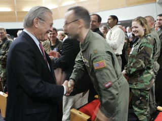 В этой речи Рамсфельд также поблагодарил всех тех, кто нес или несет службу в Ираке и Афганистане. Министр заявил, что поспешный уход американских войск из Ирака, если он состоится, станет "чудовищной ошибкой".