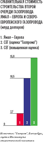 История с «обходными» трубопроводами началась с отказа «Газпрома» строить вторую нитку газопровода Ямал — Европа по территории Белоруссии и Польши в пользу идеи строительства Северо-Европейского газопровода (СЕГ) по дну Балтийского моря. Причина? Разногласия «Газпрома» с польской стороной по поводу увеличения его доли в компании-операторе газопровода — Europolgaz — с 48 до 50% акций и приемлемого для «Газпрома» уровня транзитного тарифа. Работа над строительством второй очереди трубы Ямал — Европа3 фактически прекра- тилась. Решили строить североевропейскую нитку по дну моря, что обойдется в четыре раза дороже: как признал в ап- реле 2006 года «Газпром» — в $10,5 млрд. Однако очевидно, что цена эта еще вырастет за счет расходов на часть трубы, что пойдет под водой (около 2 тысяч км) до германского Грайфсвальда. Таким образом, общая стоимость проекта, скорее всего, составит не менее $15 млрд: другими словами, за то, чтобы наказать поляков и сделать приятное бывшему канцлеру Германии, а ныне сотруднику «Газпрома» Г. Шредеру, заплатим в лучшем случае $8 млрд, в худшем — все $12,5 млрд.
