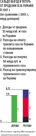 По этому соглашению Украине пришлось приобрести 41 млрд кубометров туркменского газа, 8 млрд узбекского и 7 млрд казахстанского газа. Однако выгода от этого1 досталась вовсе не российскому «Газпрому», а компании «РосУкрЭнерго». Но мало этого: России пришлось еще и доплатить Украине около $730 млн в год за повышение тарифа на транзит газа (с $1,09 до $1,6 за тысячу кубометров голубого потока).