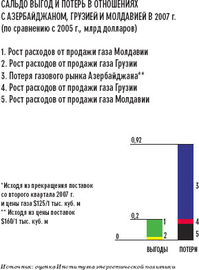 Борясь за резкое повышение цен на газ для стран СНГ, Россия потеряла ряд важных рынков сбыта газа. Прежде всего Азербайджан. Эта страна, богатая газом, пока лишь начинает разрабатывать собственные запасы и потому зависит от его импорта. Россия в одностороннем порядке разорвала заключенный ранее контракт с Азербайджаном и потребовала покупать российский газ по $230 (вместо $110). Тогда Азербайджан вообще отказался от покупки газа в России. Если учесть, что объем покупки газа в 2006 году составлял 4,5 млрд кубометров, Россия потеряла рынок емкостью примерно $720 млн в год. Кроме того, Азербайджан заявил еще и о намерении прекратить транзит своей нефти через территорию России по нефтепроводу Баку — Новороссийск: исходя из того, что в 2005 —2006 годах объемы перекачки нефти составляли около 4,5 млн тонн, это означает потерю Россией доходов от транзита на сумму более $70 млн в год.