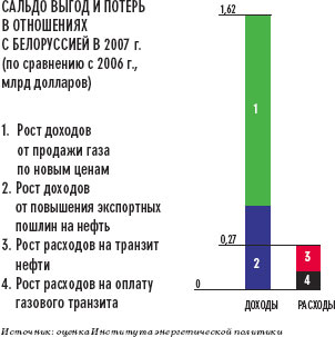 Газовый конфликт с Белоруссией принес «Газпрому» более явную выгоду. Дополнительные доходы «Газпрома» от повышения цены на газ в 2007 году составят за вычетом расходов на оплату транзита по территории Белоруссии $1 млрд. При этом «Газпром» взял на себя обязательства в течение четырех лет приобрести 50% акций газотранспортной компании «Белтрансгаз» за $ 2,5 млрд2, а взамен получает в собственность лишь 50% акций, в то время как белорусское правительство сохраняет «золотую акцию» и, по сути, командные высоты в компании.