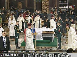 Гроб с телом первого президента России уже установлен в храме Христа Спасителя. Церемония прощания начнется в 16.30 мск.