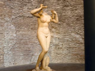 Статуя Венеры Киренской получила имя от названия древнеримской провинции Киренаика, располагавшейся на территории современной Ливии. Мраморная фигура обнаженной женщины изображает момент рождения из морской пены греческой богини любви Афродиты (римское имя – Венера). Фигура из Римского национального музея, известная также под греческим именем Афродита Анадиомена ("Выходящая из воды"), представляет собой копию более ранней эллинистической статуи. Несмотря на солидный возраст - около 1700 лет - и отсутствие головы и рук, статуя до сих пор сохранила свою прелесть и красоту.