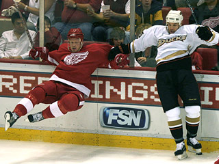 "Детройт" по-прежнему был не похож сам на себя, и моментами казалось, что еще немного, и "Анахайм" добьет обессиленного соперника, но нелепая случайность опять перевернула все с ног на голову, и на сей раз бесповоротно... За пять минут до истечения времени третьего периода в ходе атаки Гетцлаф в совершенно безобидной ситуации ударил клюшкой Бретта Лебду, после чего был отправлен на двухминутный отдых. Вот только на скамейке штрафников Райан отсидел не более четверти от времени штрафа. Первый же перепас после вбрасывания завершился мощным выстрелом Никласа Лидстрема, и после серии рикошетов от трех (!) защитников и Жигера шайба медленно заползла в ворота...