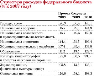 Основным катализатором роста бюджетных затрат является рост социальных расходов государства. За следующие три года расходы бюджета на социальную политику (в эту статью входит основная часть прямых социальных выплат населению) вырастут в два раза. Причины просты: население страны стремительно стареет, а социальная система коррупционна и неэффективна. Как заявил Михаил Делягин, «увеличение социальных расходов — это в первую очередь не осуществление социальной политики, а поддержка тех бизнесов, которые построены на обслуживании государственных заказов». Но доля расходов на социальную политику не превышает и 6% от общих расходов бюджета, и их рост не сможет серьезно увеличить расходную часть бюджета. Главным же получателем бюджетных излишков станут силовые ведомства. Расходы на оборону за трехлетний период вырастут на 45% в номинальном выражении, а на национальную безопасность — в полтора раза. Таким образом, силовики получают свою долю в предвыборном распиле.