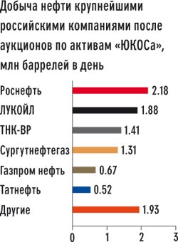 При этом госкомпания не просто выбилась в лидеры отрасли: в совокупности контролируемые государством компании «Роснефть» и «Газпром нефть» уже сейчас, по окончании аукционов по распродаже активов «ЮКОСа», добывают примерно 29% российской нефти, или 2,85 млн баррелей в день из 9,9 млн баррелей общей российской нефтедобычи.