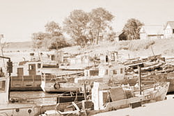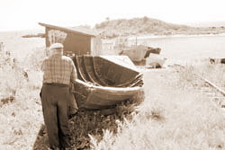 Тем временем моторка благополучно пришвартовалась в бухте. В качестве импровизированного «пирса» служит поставленная на вечную стоянку баржа. Поодаль ржавеют остатки рыболовецкого флота: все, что осталось от когда-то процветавшего тут колхоза-миллионера им. Залита. Колхоз, обанкроченный в «крутые 1990-е», и по сей день находится «в стадии ликвидации».