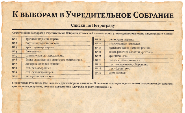 Общество ждет Учредительного собрания и, кажется, будет верить в его реальность, в то, что Россия еще обустроится демократическим путем, вплоть до большевистского декрета от 6 января. А всю осень и начало зимы спорят о программах и списках, среди которых список № 4, партия большевиков, не получает большинства голосов.