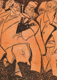 Карикатурами на Ленина и Троцкого пестрят все небольшевистские газеты. Троцкого больше. Ленина — до 25 октября — даже иногда не могут узнать под инициалами «Н. Л.» А после переворота одна из газет помещает заметку о том, что «большевики, овладев контрразведкой, первым делом бросились к делу Ленина, которое и было ими похищено»… Что волнует после петроградских и московских событий, так это сохранность дворцов, памятников и прочих ценностей. Сначала газеты волнуются, публикуют сообщения о разгроме в императорских апартаментах Зимнего, о пробоинах в куполах храма Василия Блаженного, но потом успокаиваются, тем более что многие ценности были вывезены из дворцов… на выставки! Выставки работают в семнадцатом году. И не только «Бубнового валета», например, что вполне рифмуется с революцией, но и вполне «буржуазные», архаичные.