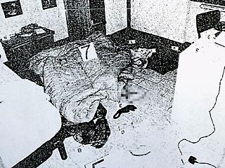 На фото видно, что тело Керчер скрыто под пуховым одеялом рядом с кроватью. В одном месте картинка замазана: вероятно, там из-под одеяла торчит нога жертвы. Рядом на полу валяется нижнее белье зверски убитой девушки.