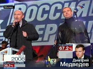 На момент выступления Путина, которое в прямом эфире транслировалось по НТВ, было обработано только 40% бюллетеней. При этом у Медведева было более 66% голосов.