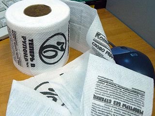 Украина в этом плане пошла дальше: в октябре 2005 года началось производство туалетной бумаги, на которой изображены известные политики. На бумаге были напечатаны портреты президента США Джорджа Буша, президента России Владимира Путина, белорусского лидера Александра Лукашенко и бывшего британского премьера Тони Блэра. Там же были изображены опальный российский бизнесмен Борис Березовский и госсекретарь США Кондолиза Райс.