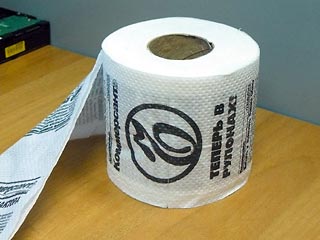 Сегодня в столице у станции метро "Арбатская" несколько молодых людей предлагали прохожим рулоны туалетной бумаги с логотипом "Коммерсанта", сообщает радиостанция "Эхо Москвы". Рулоны также содержат отрывки публикаций газеты и "слово редактора", якобы подписанное "главным редактором издания. Кроме того, на рулонах и картонных жилетах участников акции указан мобильный телефон корреспондента "Коммерсанта" Юлии Таратута, одного из авторов заметки "Наши" стали чужими". Напомним, это уже второй день "туалетной атаки" на газету.