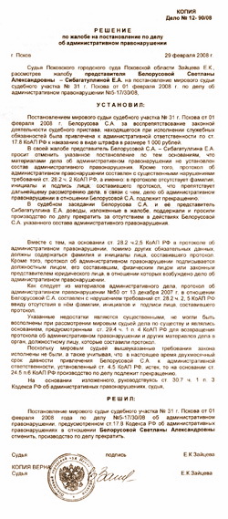 Проще говоря, еще при ознакомлении с материалами дела (до судебного разбирательства) мировой суд должен был вернуть протокол составителю для исправления существенных недостатков и надлежащего оформления. «Поскольку мировым судьей вышеуказанные требования закона исполнены не были, а также учитывая, что в настоящее время двухмесячный срок давности привлечения Белорусовой С. А. к административной ответственности, установленной ст. 4.5 КоАП РФ, истек, то на основании ст. 24.5 п.6 КоАП производство по делу подлежит прекращению». Срок исковой давности по делу Светланы Александровны истек ещё 13 февраля 2008 года.
