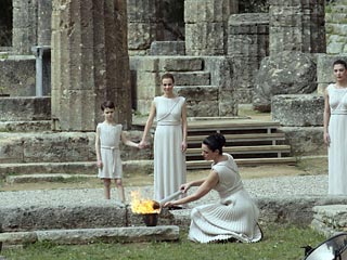 После этого верховная жрица, преклонив колено у алтаря древнегреческого храма Геры, поднесла факел к параболическому зеркалу. От солнечных лучей вспыхнул Олимпийский огонь.