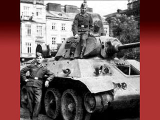 Уже вечером 6 мая на месте прежнего баннера появился новый плакат, также подписанный Петром Суминым. Только на этот раз на фотографии красовались бойцы уже в советской форме на действующем советском танке.