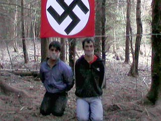 Следующий кадр - обе жертвы рядом сидят на коленях, а затем по очереди спокойно произносят: "Нас арестовали русские национальные социалисты". После чего крупный мужчина в камуфляжном костюме, маске и перчатках хватает за волосы первую жертву и с возгласом "Слава Руси!" профессиональными уверенными движениями отпиливает ей голову. Для этой цели он использует большой нож с зазубринами. На убийство уходит всего несколько секунд, оператор подходит ближе, и действие начинает сопровождаться натуралистичными звуками: сперва бульканьем крови, а затем жужжанием распиливаемого позвоночника. Далее эти звуки заглушаются музыкой электрогитары. Затем неизвестный переворачивает тело и кладет отрезанную голову рядом с ним. Развевается полотнище с изображением свастики.