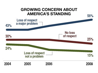 Число позитивных оценок увеличилось с 2007 года в половине стран, по которым доступны данные за предыдущий год. Такая статистика хороша для нации, но, возможно, не так хороша для Джорджа Буша, предстоящий уход которого из Белого дома в январе следующего года, вероятно, и вызвал это увеличение.