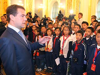 Президент назвал отношения между РФ и КНР "тесными". Он сказал, что считает приезд китайских детей в Россию "хорошим знаком" для российско-китайских отношений. "Это показатель того, что между нашими странами добросердечные, дружеские, очень тесные отношения", - пояснил Медведев.