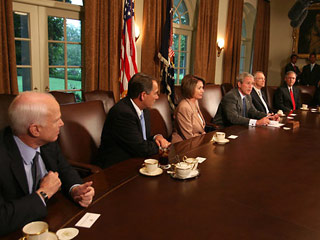 Администрация США и лидеры Конгресса договорились продолжить консультации для выработки взаимоприемлемых решений по пакету мер экономической помощи. Об этом заявила официальный представитель Белого дома Дана Перино по итогам встречи президента Джорджа Буша с законодателями, в том числе с кандидатами на пост главы государства сенаторами Джоном Маккейном и Бараком Обамой.