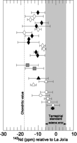В первом и четвертом выпусках ТрВ мы уже рассказывали об исследованиях, касающихся ко-роткоживущей 146Sm-142Nd изотопной системы в метеоритах и древних породах Земли, Луны и Марса. Напомним, что период полураспада 146Sm составляет около ста миллионов лет, следовательно, изотопные аномалии 142Nd в метеоритах и породах нашей планеты фиксируют первые 500-600 миллионов лет истории Земли и других планет. Важность этой изотопной системы нельзя переоценить, поскольку именно такой период в земной истории практически полностью стерт тектоническими и вулканическими процессами, а также импактными (то есть вызванными падением астероидов и комет) событиями, которые были гораздо более часты в ранней истории Земли. И самые свежие результаты исследований, посвященных этой изотопной системе, воспринимаются как настоящий научный детектив (с пока еще не ясным концом).