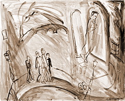 Но вот на другом – сумрачном и хмуром, будничном – полюсе петербургского настроения замечательны работы Светланы Баделиной. Они могут показаться близкими к фотореализму, с такой стремительной, цепкой точностью передана безысходность нищенских окраин, предутренних сумерек в промороженном ноябре. Что особенно митьковского в этих работах? Это просто пейзажи реалиста, жанровые сцены в городском пространстве. От «Митьков» – любовь к городу, понимаемому как вторая (рукотворная) природа: среда наших жизней.