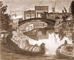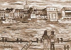 Очаровательна работа Владимира Тихомирова «Питер и его доки». Двое молодых людей смотрят здесь со стороны Горного института на то красивейшее в мире место, где, замкнутая устьем Адмиралтейского канала, кончается Английская набережная. Видна новейшая часовня на месте снесённого Спаса на Водах. Золотое восточное небо окрашивает собою волны - но перед нами, скорее всего, закат: ведь здания на левом берегу Невы освещены прямыми лучами.