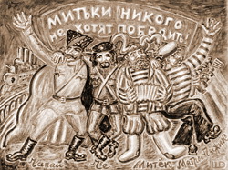 Вот против всего этого – в конечном счёте, против несвободы и пошлости, которая отвратительнее смерти – и протестуют самим своим существованием культура, искусство и «Митьки», как их яркие представители. Глубоко не случайные люди в митьковском фольклоре такие борцы с проклятой буржуазной гидрой, как В. И. Чапаев и Че Гевара. Не погаснет в сердце искусства чистое пламя бескорыстной и праведной борьбы с наживой и потребительством.