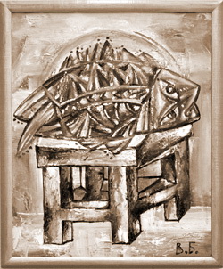 Ещё один пример невнятно мотивированного бердышевского истолкования чужих стилевых причуд – небольшая серия из четырёх сходных по формату работ: «Реквием», «Мой табурет», «Рыба на табурете», «Рыба на блюде» (всё – х., м., всё написано в 2008 г.). Здесь автор, кажется, претендует на глубокий продуманный символизм. Основой композиции (и главным «действующим лицом») повсюду является простая деревянная табуретка. Но в указанных работах мы, конечно, имеем дело не с интерьером или натюрмортом: перед нами парадоксальная попытка портрета (и даже некоторой «автопортретной» серии).