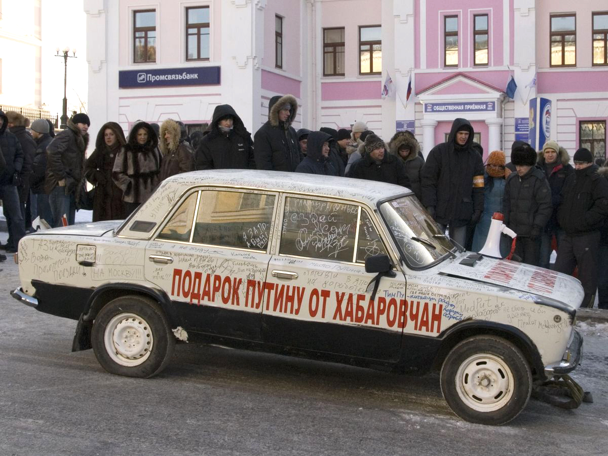 С привокзальной площади, где проводился общий сбор, колонна пикетчиков двинулась в сторону офиса хабаровского регионального отделения партии «Единая Россия». Туда же на прицепе был подтянут старый «жигуленок». Его протестующие хотели преподнести в качестве новогоднего подарка руководству хабаровского отделения партии. Сначала пикетчики спокойно ждали, а потом попытались вызвать на встречу кого-то из представителей власти.