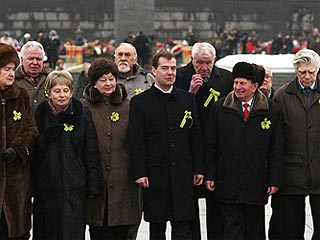 После, в рамках памятных мероприятий по случаю 65-летней годовщины освобождения города, Медведев посетил Пискаревское мемориальное кладбище и возложил цветы к монументу "Мать-Родина, где главе государства повязали зеленую "ленточку Ленинградской победы".