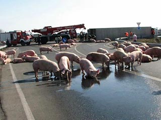 Свиньи, сбежавшие из потерпевшего аварию автопоезда, вызвали сегодня транспортный хаос на скоростной автомагистрали близ западногерманского городе Герне (федеральная земля Северный Рейн-Вестфалия).