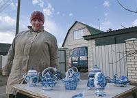 «Мне кажется, просто закончилась рабочая смена и скоро начнется другая», — грустно улыбается художница Валентина Чепрасова. С корреспондентом The New Times она беседует в пустующем здании бывшего завода майолики в селе Трошково. Валентина показывает огромные разоренные цеха, остывшие печи, разбросанные гипсовые формы: завод окончательно закрылся в ноябре 2008-го. «Обидно. Европейцы из нашей майолики сделали бы настоящий клондайк. А мы тут никому не нужны». Сегодня Валентина арендует крошечную мастерскую на территории завода по договоренности с нынешним владельцем и вместе с подругой выполняет частные заказы. На палитре — знаменитая четырехцветная гамма гжельской майолики: зеленый, желтый, коричневый, синий. Секрет ее притягательности объясняет художница Эльвира Зинонова, подруга Валентины: «Традиционный фарфор слишком холодный, правильный. А майолика — она живая, душевная, народная: что вижу, о том пою». Всё, о чем поют сегодня художницы — смешные деревенские парочки, лохматые львы, райские птицы, — скоро может уйти в историю. «За нами никого нет, — говорит Валентина Чепрасова. — Мы последние из могикан. Слишком сложно производство майолики, а истинных ее ценителей мало». И хотя представитель нынешнего владельца завода Василий Замковой заверил The New Times, что производство майолики будет возрождено, говорить о сроках он отказался.