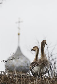 Ростов Великий В Ростове, более известном как Ростов Великий, совсем другая картина. Хотя в городе 32,5 тыс. жителей и есть кварталы многоэтажек, нового человека не оставляет ощущение, что он находится в деревне. Причем умирающей. То и дело натыкаешься на развалины, женщины с ведрами набирают воду в колонках. Кремль XIV века, внесенный в список ЮНЕСКО, бесконечно ремонтируется, и туристическим объектом назвать его можно будет очень не скоро. Местная молодежь, надо отметить, эстетического чувства до конца не утратила и любит оставлять свои автографы, вроде «Лена+Сережа», на средневековых фресках. Рождественский монастырь находится относительно в неплохом состоянии, но к его стенам вплотную примыкает склад стройматериалов, ни в какие списки ЮНЕСКО не внесенный. Лучше всего на панораму города смотреть с набережной озера Неро. Здесь турист может подвергнуться нападению домашнего гуся, а также утонуть в грязи, точно такой, какую месили древние ростовчане. Из всех достопримечательностей Ростова хорошо сохранился Спасо-Яковлевский мужской монастырь, основанный в конце XIV века. Правда, тогда он был деревянным — первые каменные постройки относятся к XVIII веку. Чтобы войти на территорию, женщинам нужно надеть юбку (придавленная камнем стопка лежит у входа), а на голову повязать платок. Денег не берут, но за все предлагают оставить пожертвование — за юбку, платок, фото- (10 рублей) и видеосъемку (30 рублей). Какие-никакие, а деньги, но когда поднимаешься на одну из монастырских башен и пред тобой открывается вид на озеро и золотые купола, понимаешь, что потратился не зря. И хотя за несколько дней поездки от обилия золота глаза немного устали, руки все равно тянутся к фотоаппарату.