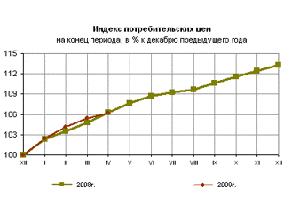 За январь-апрель 2009 года инфляция в РФ составила 6,2%, что уже на 0,1 процентного пункта меньше, чем за январь-апрель 2008 года (6,3%). Годовая инфляция в апреле снизилась до 13,2% (к апрелю 2008 года), в марте она составляла 14,0%.