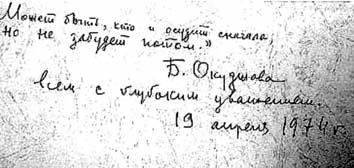 Так мы и не поняли: то ли он о ней сразу не вспомнил, то ли отнес уже к состоявшимся бардам. Скорее, последнее. Этот разговор завершился раздачей автографов (см. фото; рядом с поэтом — К.И.Дмитриев, д.т.н., ТРИНИТИ). Я получил его на сборник «Арбат, мой Арбат».