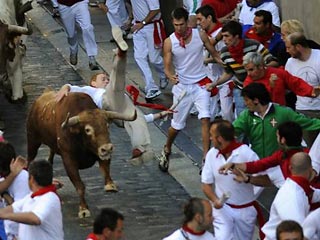 Огромный бык в пятницу утром оторвался от стада во время очередного забега на празднике Святого Фермина в испанском городе Памплона и ранил семерых человек. Все пострадавшие были госпитализированы с ранениями различной степени тяжести, один из них позднее скончался в больнице от ран, нанесенных обезумевшим животным, сообщает Национальное телевидение Испании (TVE1).
