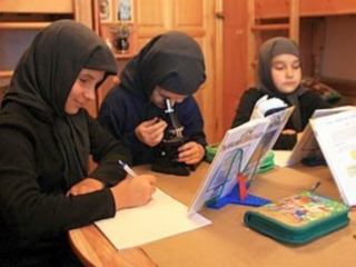 В кельях уютная, почти домашняя обстановка - коврики, стульчики, двухъярусные деревянные кроватки, отметили посетители из газеты. Семи-восьмилетние воспитанницы в черных одеяниях, похожие на воронят, за столом штудируют учебники "Природоведение". На столе микроскоп. Глазки у девчонок смышленые, живые...