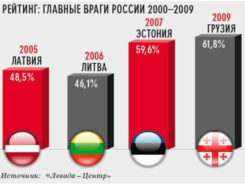 Грузия — главный враг нашей страны, так считают 62% россиян. Это «лидерство» в ближайшее время вряд ли кто-то сможет оспорить — прошлогодняя война в Южной Осетии по-прежнему занимает центральное место в СМИ. На втором месте в списке «нелюбимых» стран идут США. В представлении многих россиян прошлогодняя война была не только, а может быть, и не столько конфликтом между Грузией и Россией, сколько столкновением Соединенных Штатов и России. Когда социологи спрашивали о причинах войны, большая часть опрошенных винила политику США, которые пытаются-де вытеснить Россию из традиционных зон влияния, то есть с Кавказа и из ближнего зарубежья. Замыкает тройку Украина. После того как там случилась «оранжевая революция», российским СМИ дали отмашку: мочить! Еще в марте 2005 года к Украине относились негативно лишь 22% россиян, а в мае 2009-го — уже 56%. Во враги россияне также записали страны Балтии: Латвию (35%), Литву (35%), Эстонию (30%).