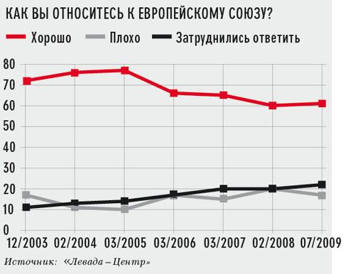 К Европейскому союзу при этом граждане относятся скорее нейтрально. Лишь 22% опрошенных относятся негативно к единой Европе. Евросоюз воспринимают скорее как экономическое, государственное объединение стран, которое, в общем, ничем не задевает великодержавного сознания россиян.