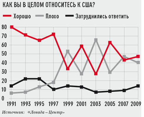 А ведь еще 20 лет назад общество было настроено совсем по-другому. Лишь 13% тогда утвердительно отвечали на вопрос: «Есть ли у страны враги?» В том, полном надежд 1989 году СССР стоял на переломе: граждане понимали, что 70 лет коммунистического режима задвинули страну на обочину истории. К США негативно относились тогда всего 7% опрошенных. Прежнее убеждение, поддерживаемое коммунистической пропагандой, что СССР находится «в кольце врагов», рушилось буквально на глазах. Появилась надежда, что дальше будет лучше, как минимум потому, что хуже уже было некуда.