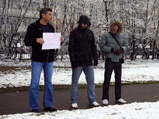 На вопрос, зачем они прячут лица, молодые люди заявили, что они "экстремисты". В итоге на месте снова появились милиционеры, но задержали не "экстремистов", а Александра Рыклина.