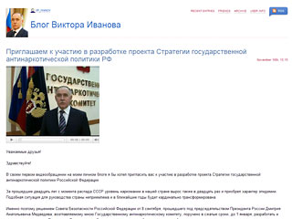 Директор Федеральной службы по контролю за оборотом наркотиков (ФСКН) Виктор Иванов присоединился к ряду высоких государственных персон, которые завели сетевые дневники. Глава антинаркотического ведомства завел блог в "Живом журнале". Как передает РИА "Новости", в размещенном на страничке видеообращении, Иванов призвал интернет-пользователей поучаствовать в разработке проекта Стратегии государственной антинаркотической политики.