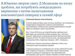 Президент Украины Виктор Ющенко 19 ноября обратился с открытым письмом к президенту России Дмитрию Медведеву, предлагая решить ряд проблем "с целью установления взаимовыгодного сотрудничества в газовой сфере".