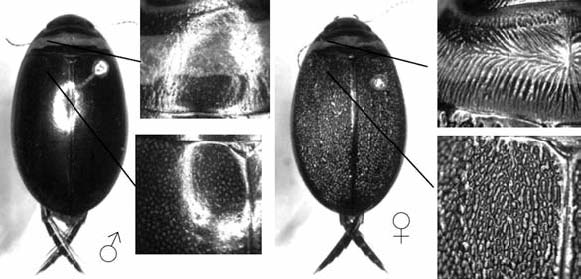 У многих видов плавунцов, особенно таких, у которых самцы наделены многочисленными и эффективными присосками, у самок выработалось приспособление, помогающее им отбиваться от насильников. Поверхность пе-реднеспинки и надкрылий у них не гладкая, как у самцов, а неровная, и к ней сложнее прикрепиться с помощью присосок. У видов рода Dytiscus (к которому относится самый известный жук-плавунец — Dytiscus marginalis, плавунец окаймленный) надкрылья самок покрыты узкими параллельными бороздками, у видов рода Acilius — широкими бороздками с густо опушенным дном, а у одного из видов рода Graphoderus (G. zonatus) гранулированы, т.е. покрыты многочисленными выпуклостями, похожими на гранулы.