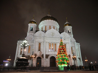 Патриарху сослужили более 20 архиереев и сотни священников. Всего в кафедральном храме собралось более пяти тысяч человек. В центре и у северной стены - иконы Рождества, украшенные хвойной сенью с белыми цветами. Одна из икон - точная копия той, что находится в Вифлееме. Перед входом в храм на Волхонке - большая ель, у подножия которой ледовые фигуры Святого Семейства.