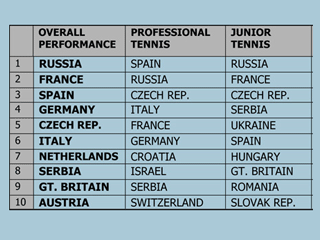 Россия удостаивалась высшей награды ТЕ в общем зачете и в отдельных категориях также в 2005-2008 годах. Второй в списке лучших теннисных наций Европы за 2009 год признана Франция, вслед за которой следует Испания, занявшая лидирующую позицию в категории "профессиональный теннис". Лучшей в ветеранском теннисе признана Германия, а Голландия традиционно лидирует в категории "теннис на колясках".