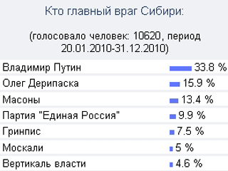 Как отмечает издание Babr.ru, Путин вышел в лидеры за первые сутки голосования. Сейчас у Путина уже 33,8%. Занимающий вторую строчку Дерипаска набрал 16% голосов. Третье место в списке врагов Сибири заняли масоны - за них проголосовали 13,4% респондентов.