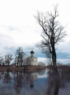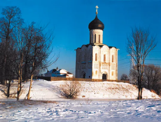 В километре с небольшим от Боголюбова стоит памятник, широко известный по всему миру, — храм-мемориал в память об умершем в 1165 г. сыне Боголюбского — Изяславе, храм-памятник в честь победы Боголюбского над булгарами в 1164 г. (на этой войне сын Андрея и получил раны, от которых умер). Речь идет о знаменитом храме Покрова на Нерли. Сейчас считается, что это — самый совершенный памятник древнерусской архитектуры, однако исследования Николая Воронина показали, что, на самом-то деле, это изящное здание выглядело совсем иначе. То, что глава была шлемовидной, а не луковичной, понятно всем, знакомым с древнерусской архитектурой. Луковичную главу поставили только в начале XIX в. Однако оказалось, что в древности храм окружали на половину высоты галереи, а сама церковь стоит на искусственном холме. В те времена весной уровень воды здесь повышался на 3,5 м. Так что пришлось специально повышать рельеф, а фундаменты церкви опускать на глубину 5,3 м! Стены холма были облицованы белым камнем, а к воде спускалась лестница. Насколько изменяется вид привычной стройной, хрупкой церкви! Перед нами не романтичная постройка, а парадный храм, ослепляющих всех плывущих по Нерлю своим величием.